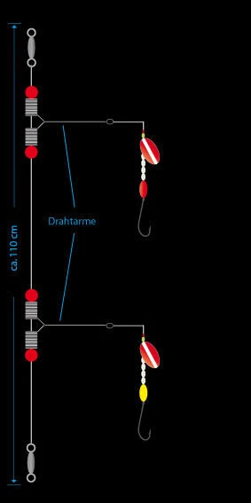 Typisches Plattfischvorfach mit hoher Lockwirkung durch Fluo-Perlen und Locklöffel. Die Drahtarme verhindern Verwicklungen beim Wurf. Ausgestattet mit Black Nickel Baitholder Hooks.
