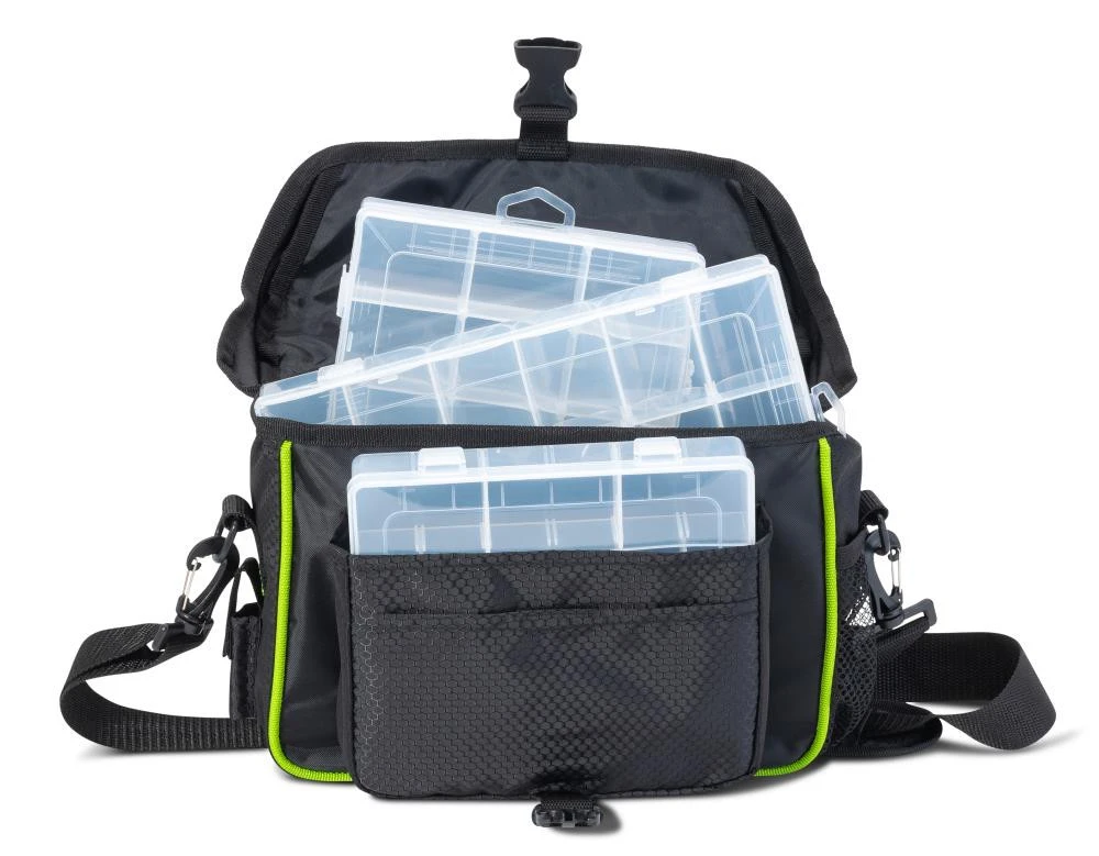 Diese Profi-Angeltasche besitzt eine wasserabweisende Beschichtung und besteht aus 100% 600D Polyester. Durch das innovative und partielle „Honey Comb“ Muster wirkt diese Angeltasche hoch modern. Es stehen zwei Größe zur auswahl, die jeweils eine kleine Fronttasche besitzen. Zu jeder Tasche gehören 3 Köderboxen, die im Lieferumfang enthalten sind,